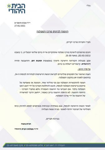 בהזמנה שיצאה מהבית היהודי כי על סדר היום: "הצגה ואישור של הסכמים פוליטיים לקראת הגשת הרשימות לבחירות לכנסת ה-24". עוד נכתב כי ההצעה להתקשרות המפלגה עם גוף פוליטי אחר, תובא להחלטת המרכז על ידי יושב ראש המפלגה בלבד. אך, "אם הצביעו נגד ההצעה האמורה 60% מחברי המרכז – נדחתה ההצעה. לא נדחתה ההצעה ברוב כאמור, ייחשב הדבר לאישורה של ההצעה על ידי מרכז המפלגה. לאחר הגשת הרשימה לכנסת, נצא באחדות ובכוחות משותפים למסע לחיזוק כוחו הפוליטי של הציבור הדתי-לאומי".