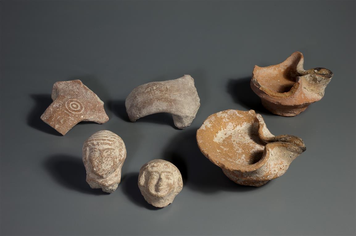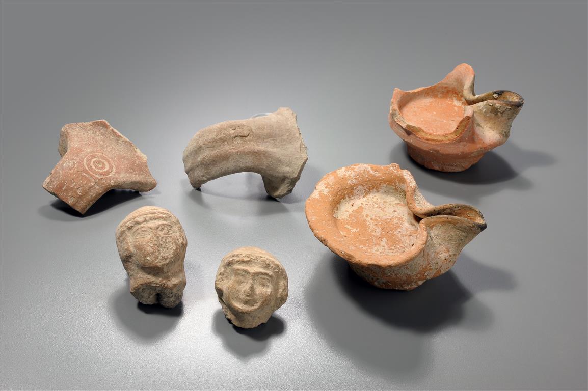 ממצאים משכבת המילוי של סוף תקופת בית ראשון: נרות, ידיות למלך וצלמיות נשים. (קלרה עמית, רשות העתיקות)