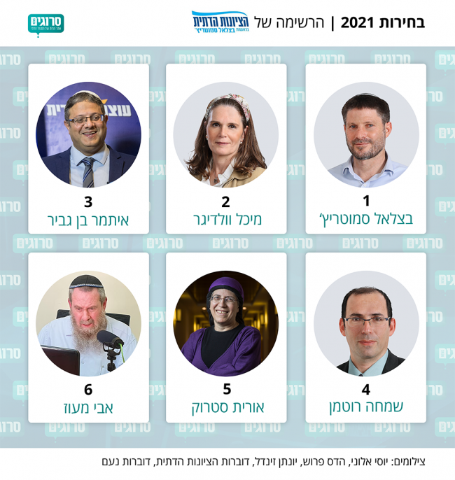 1. בצלאל סמוטריץ' – יו"ר מפלגת הציונות הדתית. חבר ועדת הכספים. שר התחבורה וחבר הקבינט המדיני-ביטחוני לשעבר. כשר התחבורה הוציא לפועל את מיזם נתיב פלוס בנתיבי איילון ובכביש החוף, בנוסף הביא לזירוז חשמול הרכבת בין תל אביב לירושלים. כח"כ הוביל את שדולת ארץ ישראל בכנסת ואת חוק ההסדרה לצד שורת חוקיים חברתיים. הוביל את המאבק להשארת שדה דב למען תושבי אילת.