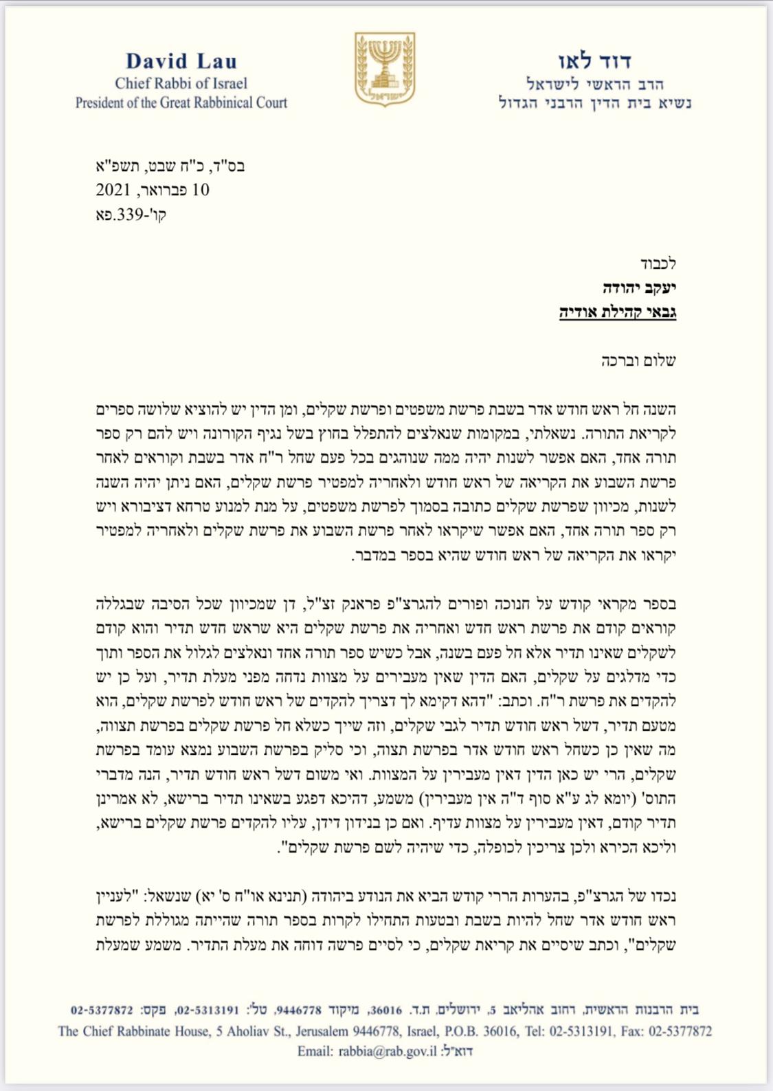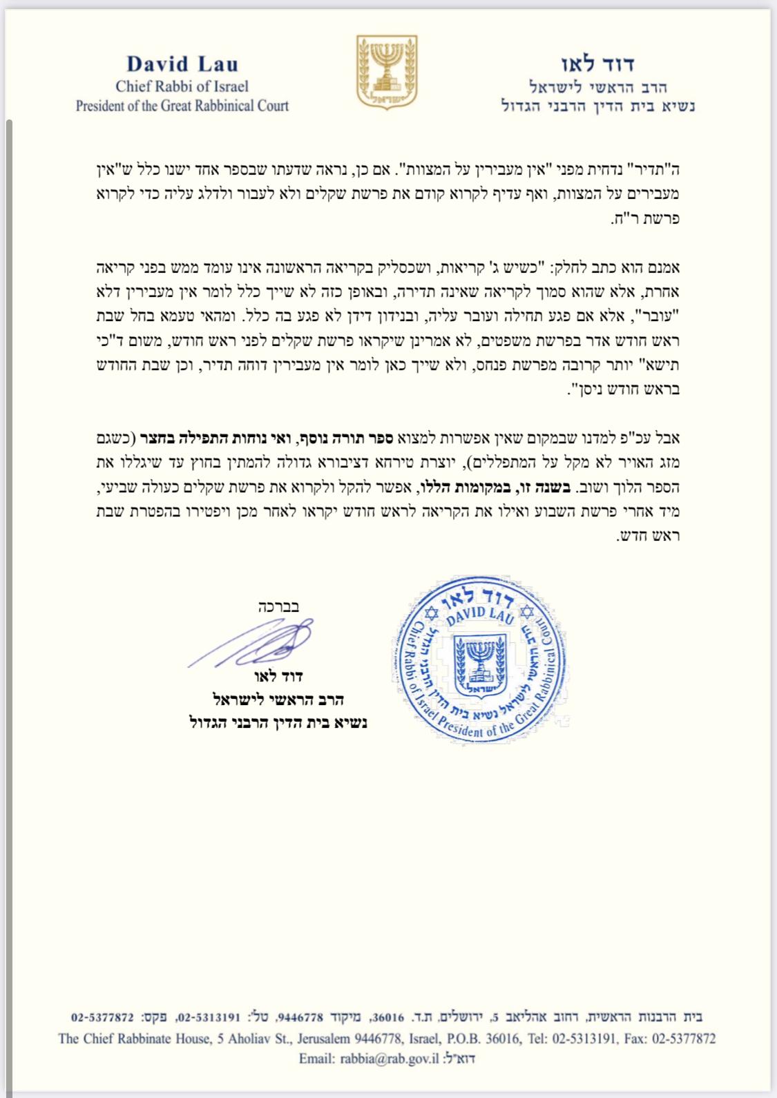במענה לשאלות של גבאים, השיב הרב לאו: "בשל המצב מניינים רבים מתקיימים בחצרות ובמקומות מאולתרים כך שלא ניתן לארגן שם שלושה ספרי תורה ולרשותם עומד רק ספר תורה אחד, במצב זה כאשר פרשת שקלים סמוכה לפרשת השבוע – משפטים, ופרשת ראש חודש נמצאת הרחק בספר במדבר. במידה ויקראו לפי הסדר הרגיל יצטרכו בסיום פרשת השבוע לגלול באריכות לספר במדבר לקריאת ראש חודש ולאחר מכן לגלול חזרה לספר שמות לפרשת שקלים."