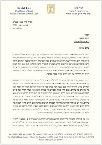במענה לשאלות מגבאי מנייני קורונה ברחבי הארץ, השיב הרב הראשי כי ניתן לקרוא השנה את פרשת שקלים, לפני קריאת ראש חודש, בשל "טרחא דציבורא גדולה".