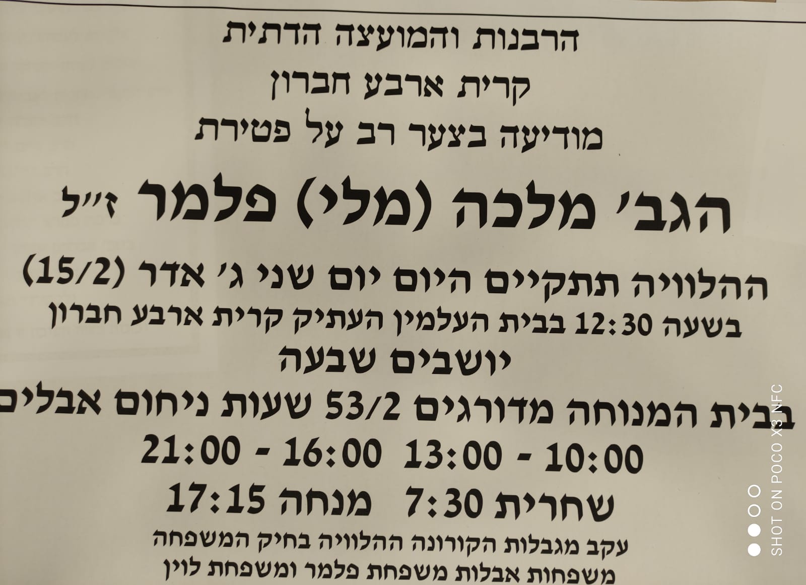 הלוויתה תתקיים בבית העלמין העתיק בחברון בשעה 12:30