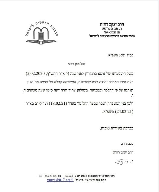 כשנה אחרי שנעלם במדבר יהודה, ואחרי שכל החיפושים עלו בתוהו, משפחת ברנדווין קיבלה פסק הלכה מהרב יעקב רוז'ה האחראי על הקבורה ברבנות הראשית, לפיו הוא אינו נחשב בין החיים, ולכן יש לשבת עליו 'שבעה'.