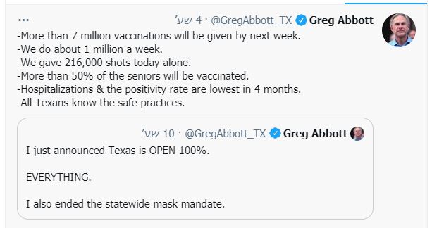"הכרזתי כעת כי טקסס תהיה פתוחה לחלוטין" הודיע אתמול המושל אבוט. "הכול. כמו כן אני מבטל את החובה לעטות מסיכות".