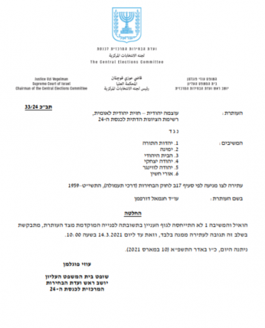 בתשובה לעתירתו של בן גביר לוועדת הבחירות נגד יהדות התורה, ימינה והבית היהודי, יו"ר הועדה, השופט עוזי פוגלמן, הוציא החלטה לפיה רק מפלגת יהדות התורה נדרשת להשיב לעתירה של בן גביר תוך שלושה ימים עד יום ראשון הקרוב. השופט נימק זאת בטענה כי יהדות התורה היא היחידה מבין המפלגות שלא נתנה תשובה לגופו של עניין בפנייה מוקדמת של בן גביר על הפצת הסרטונים, שלא כמו בימינה ובבית היהודי שהכחישו את מעורבותם בעניין.