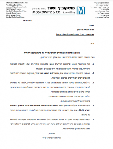 - "אשר לסרטונים – הגם שבפנייתך לא צירפת את האופן שבו פורסמו הסרטונים, אלא רק את הסרטונים עצמם, אבהיר באופן מפורש כי למרשתי אין קשר לסרטונים אלו. לא בעריכתם, לא בהפצתם, ולא בפרסומם".