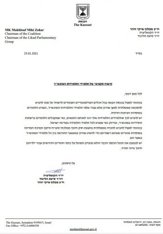 במהלך חודש ינואר, יו"ר הקואליציה ויו"ר סיעת הליכוד, ח"כ מיקי זוהר, שיגר מכתב ובו הצהיר כי הוא מתחייב לפעול למען שיוויון מלא עבור בין תלומדי התורה הציוניים לחרדים.