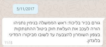 13 פעם לפחות טירפד נתניהו את הצעת החוק שהגישה שולי מועלם מהבית היהודי(אחר כך הימין החדש, היום כבר בליכוד), בתמיכת עשרות חברי כנסת מהליכוד ומשאר הקואליציה. בסוף כנס הקיץ האחרון, תלה נתניהו את העיכוב בפגישה שיש לו בלונדון. הרווח – הצליח למשוך עוד חצי שנה, בלי לעשות כלום בנושא ההתנתקות, מה שלא יפריע לצוות הקמפיין שלו לספר שהוא בעצם התנגד להתנתקות.