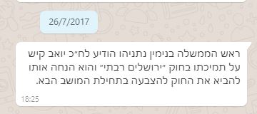 יו"ר השדולה למען ארץ ישראל יואב קיש מעלה את הצעת החוק 'ירושלים רבתי' לחיבור ערים וישובים מסביבי לירושלים, כולל כאלה מחוץ לקו הירוק, לעיר הבירה. נתניהו כמובן תומך ומבקש לקדם. מה נעשה עם זה – כמובן כלום. התירוץ – התנגדות אמריקנית למהלך.