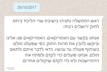 "לאחר עבודת מטה בישראל ובתיאום עם ארצות הברית תובא לממשלה החלת החוק הישראלי על שטחים נוספים. זה ייקח קצת זמן. נבטל את הממשל הצבאי מעל חצי מיליון ישראלים בהתנחלויות בעקבות החלטת הממשלה".