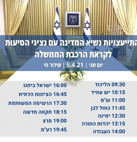את מצעד ההמלצות יפתחו בשעה 09:30 נציגי סיעת הליכוד ואחריו כל 45 דקות יגיעו הסיעות הבאות בתור, לפי גודלן, כשסיעת רע"מ תחתום אחרונה את היום בשעה 19:45. (למעט הפסקה בין 15:00-16:00)