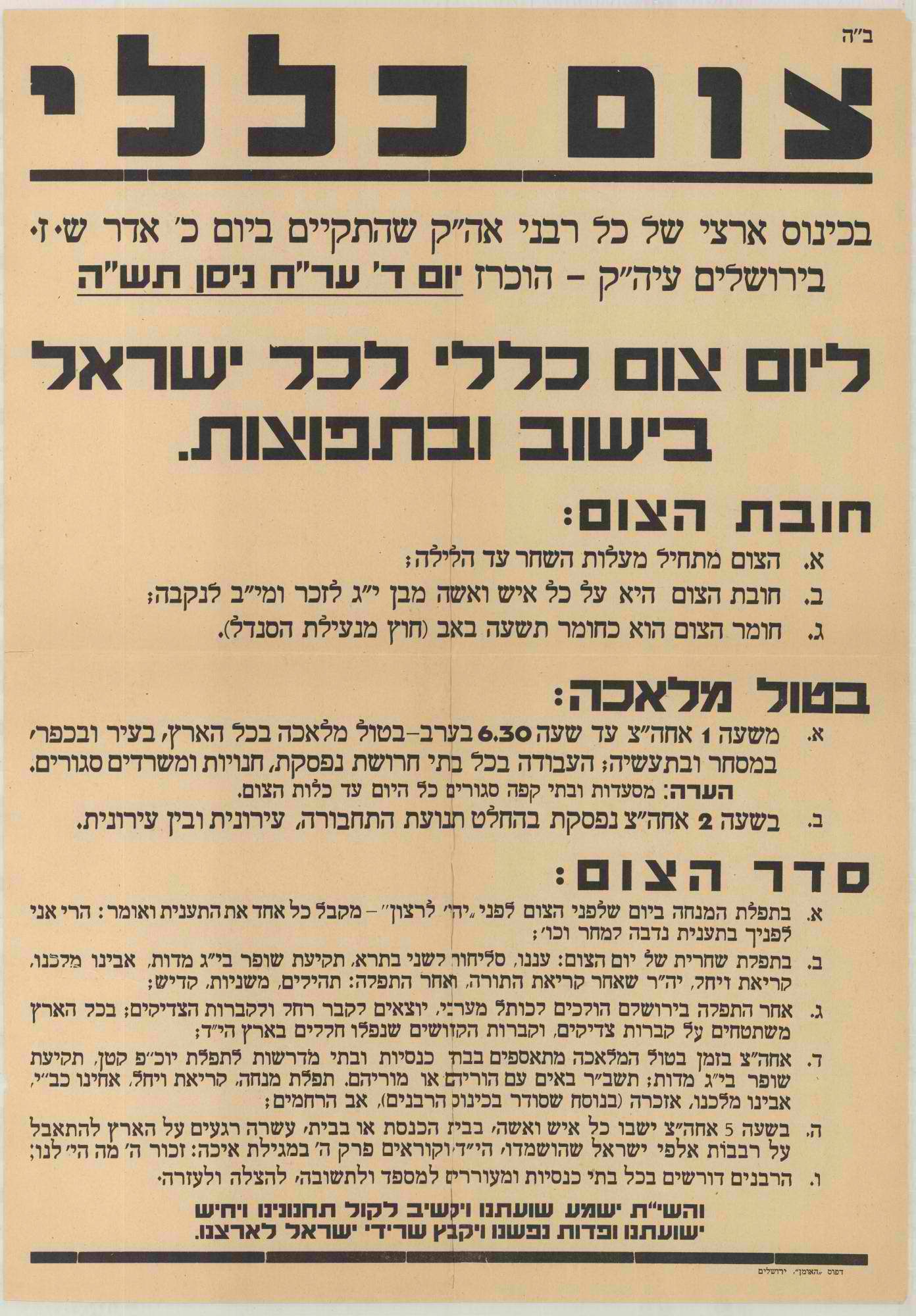 "ישיבת אבל – בשעה 5 אחה"צ יושב כל איש ואשה בבית הכנסת ובבתים 10 רגעים על הארץ, להתאבל על רבבות אלפי ישראל הי"ד ולקרוא פרק ה' במגילת איכה: 'זכור ה' מה היה לנו'. רצוי שהמוסדות ידאגו לכך כי על התחלת ישיבת האבל ועל סופה יודיעו לקהילה על ידי צפירת אזעקה".