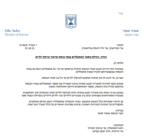 ח"כ סופר ביקש לגבש מתווה עדכני וכתב במכתבו: "אבקש ממך להורות למשרדך לגבש מתווה עדכני המגדיל את מספר המתפללים בבתי הכנסת בהתאם לגודל בית הכנסת, מספר המתחסנים והיקף התחלואה הנמוך. אבקש גם כי תנחה את משרדך לגבש מתווה חדש לכניסת ילדים לבתי הכנסיות תוך התחשבות בעובדה שמתרחשים מפגשים רבים בין מבוגרים לילדים ובין ילדים לילדים בקהילה ובבתי ספר. מן הראוי שפתיחת כלל המשק תתבטא בבתי הכנסיות שמתפלליו רובם ככולם מחוסנים ומקפידים על הנחיות הקורונה השונות, עוטים מסיכות ושומרים על כללי משרד הבריאות".