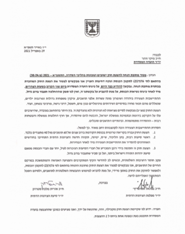 בסיום המכתב הדגישו: ״עקב חוסר היציבות השלטונית, ובשים לב לחודשי הקיץ המתקרבים והפגיעה האנושה והמתמשכת במרקם החיים של התושבים, אנו מבקשים לפטור את הצעת החוק מחובת ההנחה, ולאפשר לחוקק את החוק באופן מיידי, על מנת להביא למימוש ההבטחה השלטונית לתושבים, ולסיום הסבל המתמשך ואפלייתם לרעה".