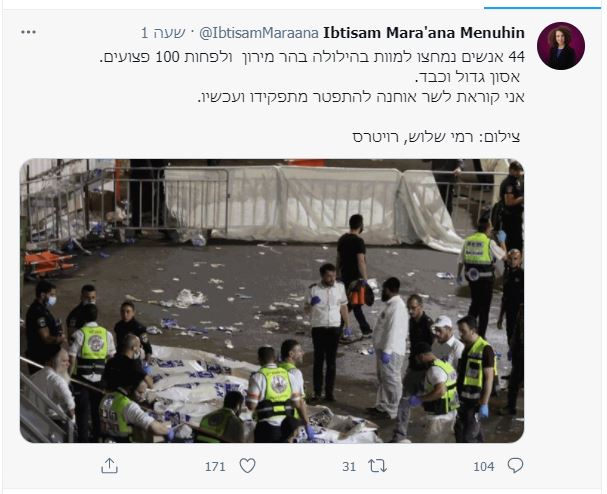 "44 אנשים נמחצו למוות בהילולה בהר מירון ולפחות 100 פצועים. אסון גדול וכבד." צייצה מרעאנה השכם בבוקר.