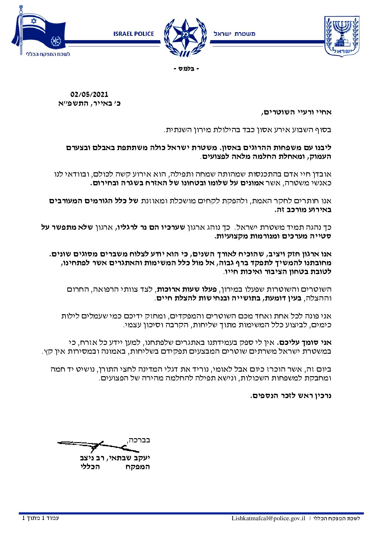 כך פנה הבוקר המפקח הכללי של משטרת ישראל, רב ניצב יעקב שבתאי באיגרת לכל השוטרים והמפקדים במשטרה בעקבות האסון במירון.