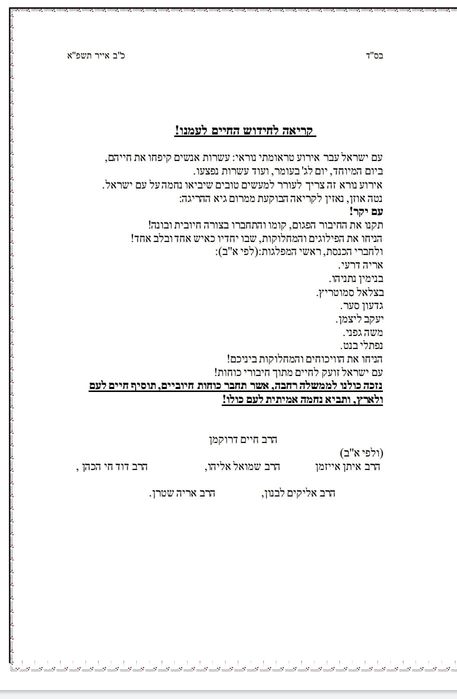 במכתב פנו הרבנים למפלגות המייצגות 65 מנדטים בכנסת, בקריאה להתאחד ולזנוח את המחלוקת והשנאה האישית אשר מביאה איתה חורבן ופגיעה בכבודנו הלאומי.