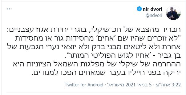 "חבריו מהצבא של חכ שיקלי, בוגרי יחידת אגוז עצבניים: "לא זוכרים שהיו שם ׳אחים׳ מחסידות גור או מחסידות אחרת ולא ליטאים מבני ברק ולא יוצאי נערי הגבעות של בן גביר – ׳אחיו לגוש הפוליטי המותר׳. ההחרמה של שיקלי של מפלגות השמאל הציוניות היא יריקה בפני חייליו בעבר שמאחים הפכו למנודים."