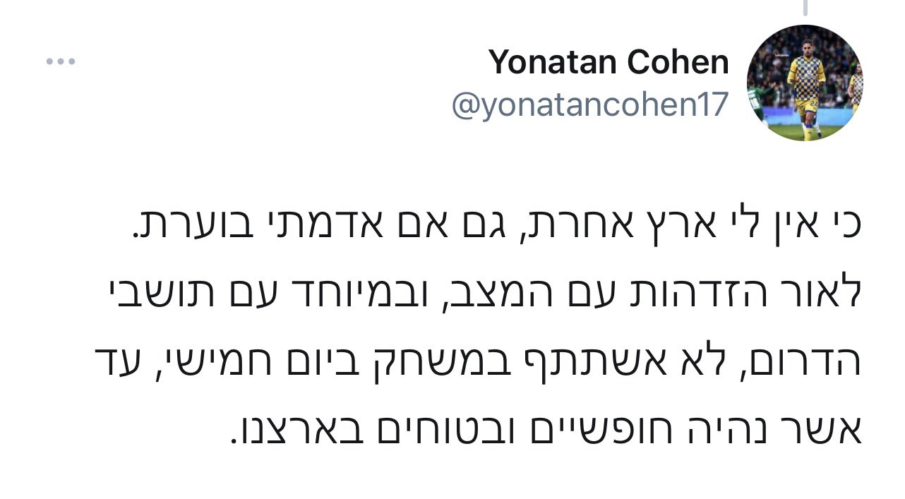 כי אין לי ארץ אחרת, גם אם אדמתי בוערת. לאור הזדהות עם המצב, ובמיוחד עם תושבי הדרום, לא אשתתף במשחק ביום חמישי, עד אשר נהיה חופשיים ובטוחים בארצנו."