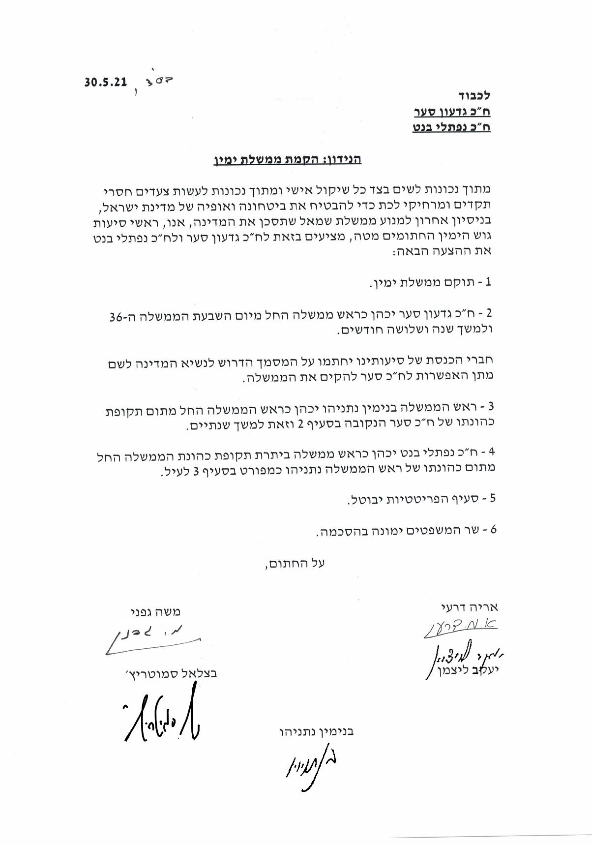״מתוך נכונות לשים בצד כל שיקול אישי ומתוך נכונות לעשות צעדים חסרי תקדים ומרחיקי לכת כדי להבטיח את ביטחונה ואופייה של מדינת ישראל, בניסיון אחרון למנוע ממשלת שמאל שתסכן את המדינה, אנו, ראשי סיעות גוש הימין החתומים מטה, מציעים בזאת לח״כ גדעון סער ולח״כ נפתלי בנט את ההצעה הבאה".