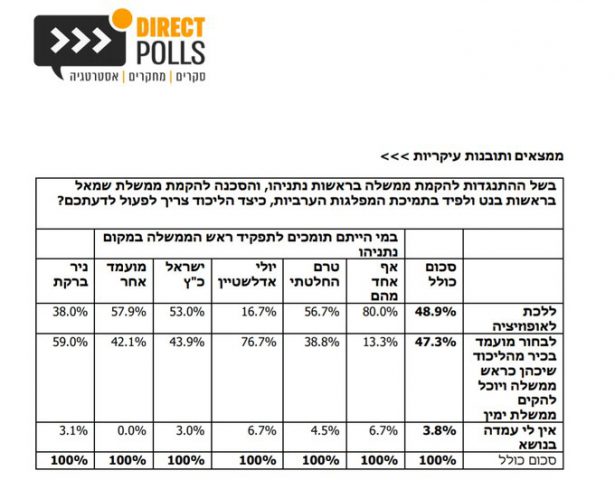 בפריימריז האחרונים ב-2019 זכה נתניהו ל-72% תמיכה ואילו כעת התמיכה בו ירדה ל-49% בלבד. התומכים בהזזתו והקמת ממשלה בידי מועמד אחר מהליכוד הגיעו ל-47%.