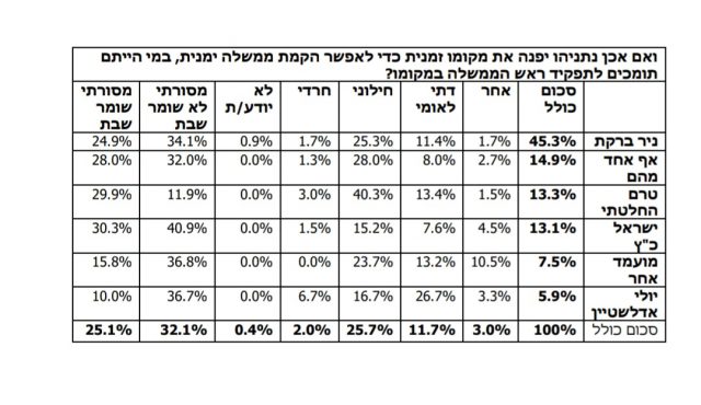בשאלה, מי המועמד שצריך להחליף את נתניהו, ניר ברקת ממשיך להוביל עם 45%, ישראל כ"ץ עם 13% ועוד 35% לא החליטו או שלא רוצים לראות אף אחד מהם מחליף את נתניהו.