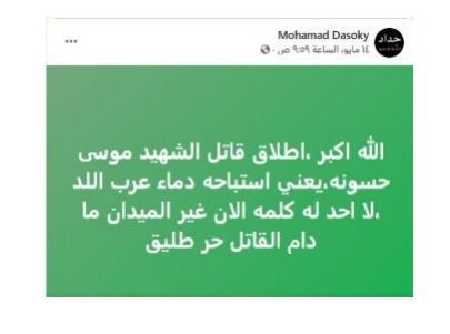 לפי התלונה, ביום שישי, ה- 14/05, פרסם דסוקי פוסט בו הוא קורא להבערת השטח: "אללה אכבר, שחרור רוצחו של השהיד מוסא חסונה משמעותו התרת דמם של ערביי לוד" נכתב בפוסט. "רק השטח ידבר עכשיו (או בשדה הקרב), כל עוד הרוצח חופשי".