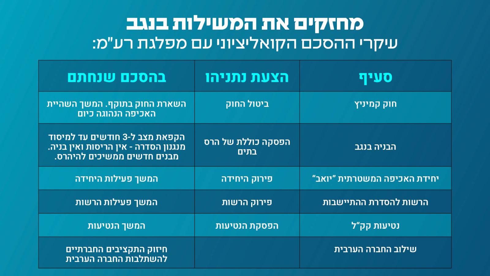 יו"ר הליכוד, בנימין נתניהו הציג טבלה בה סיכם את עיקר הוויתורים של בנט ולפיד לערבים. לפי נתניהו, הממשלה החדשה תבטל את חוק קמיניץ, תכיר ברוב הישובים הלא חוקיים בנגב ותתן את ראשות ועדת הפנים לעבאס. כמו גם תקציבים בשיעור פי שלושה מאשר ההצעה של הליכוד.