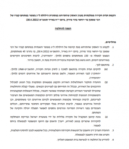 ראש הממשלה נפתלי בנט וראש הממשלה החליפי יאיר לפיד הכניסו במסגרת ההסכמים הקואליציוניים את המחויבות של הממשלה בראשותם להקים ועדת חקירה ממלכתית לאסון הכבד במירון.