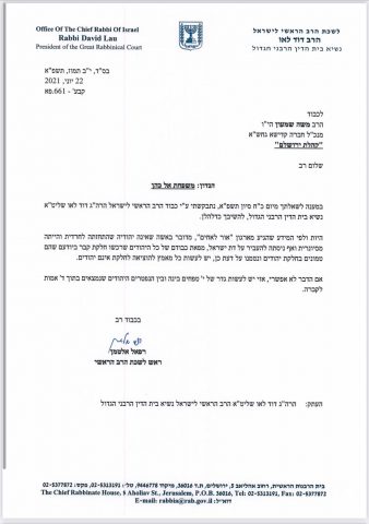 במענה לפנייה השיב הרב הראשי באמצעות ראש לשכתו רפי אלטמן, כי "היות ולפי המידע שהגיע מארגון 'אור לאחים', מדובר באשה שאינה יהודייה שהתחזתה לחרדית והייתה מסיונרית ואף ניסתה להעביר על דת ישראל, מפאת כבודם של כל היהודים שרכשו חלקת קבר ביודעם שהם טמונים בחלקת יהודים ונטמנו על דעת כן, יש לעשות כל מאמץ להוציאה לחלקת אינם יהודים".