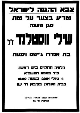 סגן משנה שילי ווסטלנד ז"ל מקיבוץ ניר עוז שבעוטף עזה. בחיל רפואה הוקם צוות מומחים לבחון את נסיבות מותה. הלווייתה תיערך ביום ראשון בקיבוץ ניר עוז, בשעה שש בערב. ווסטלנד היא חלל צה"ל הראשונה לבית קיבוץ ניר עוז.