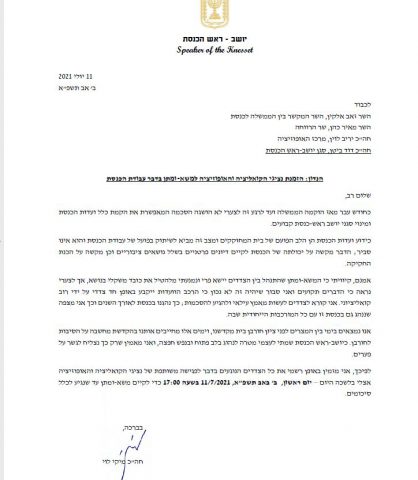 המכתב ששיגר יו"ר הכנסת לצדדים