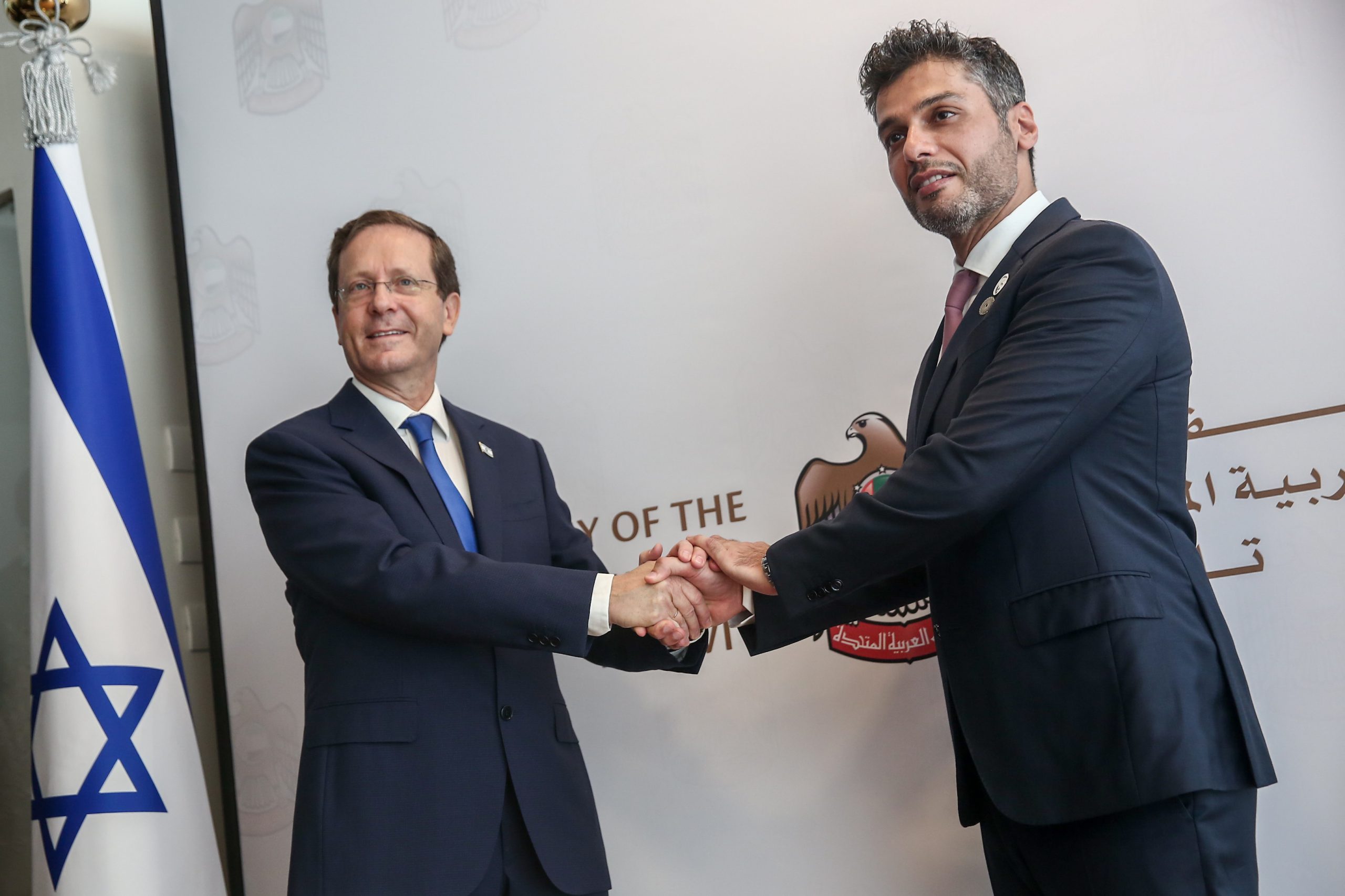 נשיא המדינה יצחק הרצוג השתתף היום (ד') באירוע פתיחת שגרירות איחוד האמירויות הערביות בישראל בבורסה לניירות ערך בתל אביב. את הנשיא אירח שגריר איחוד האמירויות הערביות בישראל, מוחמד אל חאג'ה.