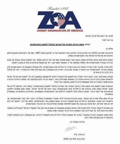 אחרי הסערה בעקבות דבריו של שר החוץ, יאיר לפיד, בנאום שנשא בפורום הגלובאלי למאבק באנטישמיות, שלחו אליו היום (שישי) ארגון ציוני אמריקה (ZOA) מכתב תגובה.