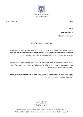 עוד הוסיף: "גם שבממשלת השינוי הנוכחית איבדו את הבלמים ואבדה לה הבושה, איש אשר הישר בעיניו יעשה ואין פוצה פה ומצפצף, עדיין, כאנשי חוק, לא נבליג ולא נשקוט על כל ניסיון לפגיעה כזו או אחרת בלשון החוק ובאפליית והדרת ציבורים כאלו או אחרים. אבקשך לפעול בעניין ללא דיחוי ולהבהיר את עמדתך, עמדת החוק, בדבר אפלייה מגדרית האסורה, ולבלום במיידית את החפצים בדריסת החוק ברגל גסה".