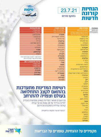 רק היום (חמישי), ראש שירותי הבריאות ד"ר שרון אלרעי פרייס אמרה בוועדת החוקה: "אם ממשיכים במודל הנוכחי, יוון בולגריה ואיחוד האמירויות ייכנסו בשבוע הבא לרשימת המדינות ברמת סיכון מרבי שהיציאה אליהן אסורה; איטליה וצרפת ייכנסו לאזהרת מסע חמורה".