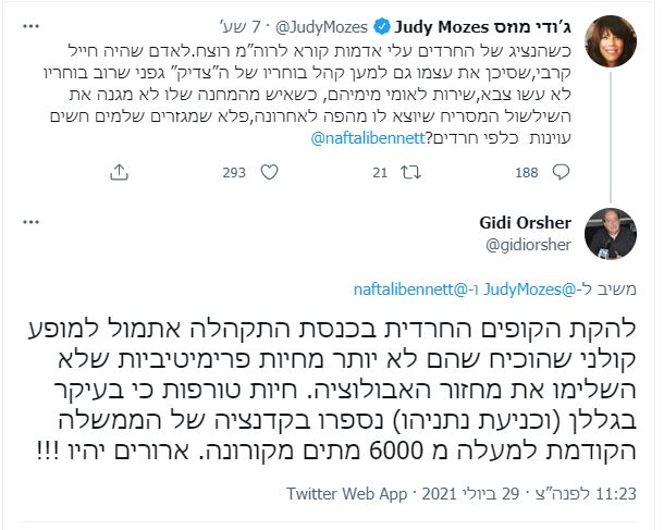 "להקת הקופים החרדית בכנסת התקהלה אתמול למופע קולני שהוכיח שהם לא יותר מחיות פרימיטיביות שלא השלימו את מחזור האבולוציה. חיות טורפות כי בעיקר בגללן (וכניעת נתניהו) נספרו בקדנציה של הממשלה הקודמת למעלה מ 6000 מתים מקורונה. ארורים יהיו!!!"