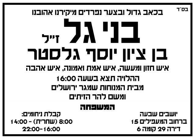 ההלוויה של בני גל תצא היום בשעה 16:00 מבית הלוויות שמגר ומשם ל'הר הזיתים'.