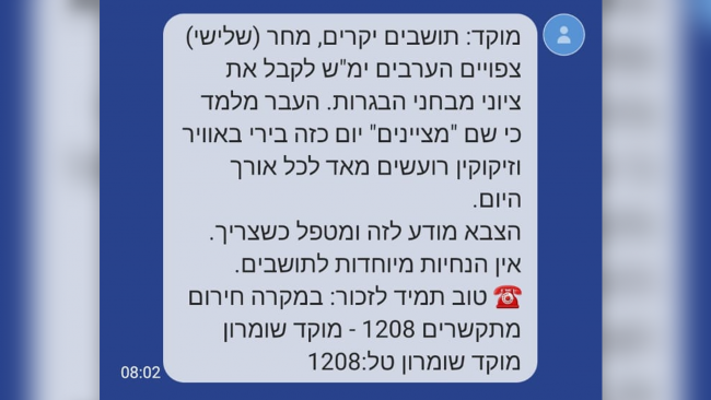 בהודעה נאמר: "תושבים יקרים, מחר צפויים הערבים ימ"ש לקבל את ציוני מבחני הבגרות. העבר מלמד כי שם "מציינים" יום כזה בירי באוויר וזיקוקין רועשים מאוד לכל אורך היום. הצבא מודע לזה ומטפל כשצריך, אין הנחיות מיוחדות לתושבים". בנוסף, ההודעה כללה פרטים ליצירת קשר במקרה חירום.