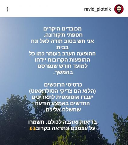 רביד פלונטניק מודיע היום (חמישי) לעוקביו כי הוא נמצא חיובי לנגיף הקורונה. כך הוא כתב: "מכובדי היקרים חטפתי ת'קורונה אני חש בטוב תודה לאל ונח בבית" פלוטניק המשיך והודיע על דחיית הופעותיו: "ההופעה הערב, כמו כל ההופעות יידחו למועד חדש שנפרסם בהמשך, בריאות ואהבה לכולם. תשמרו על עצמכם ונתראה בקרוב".