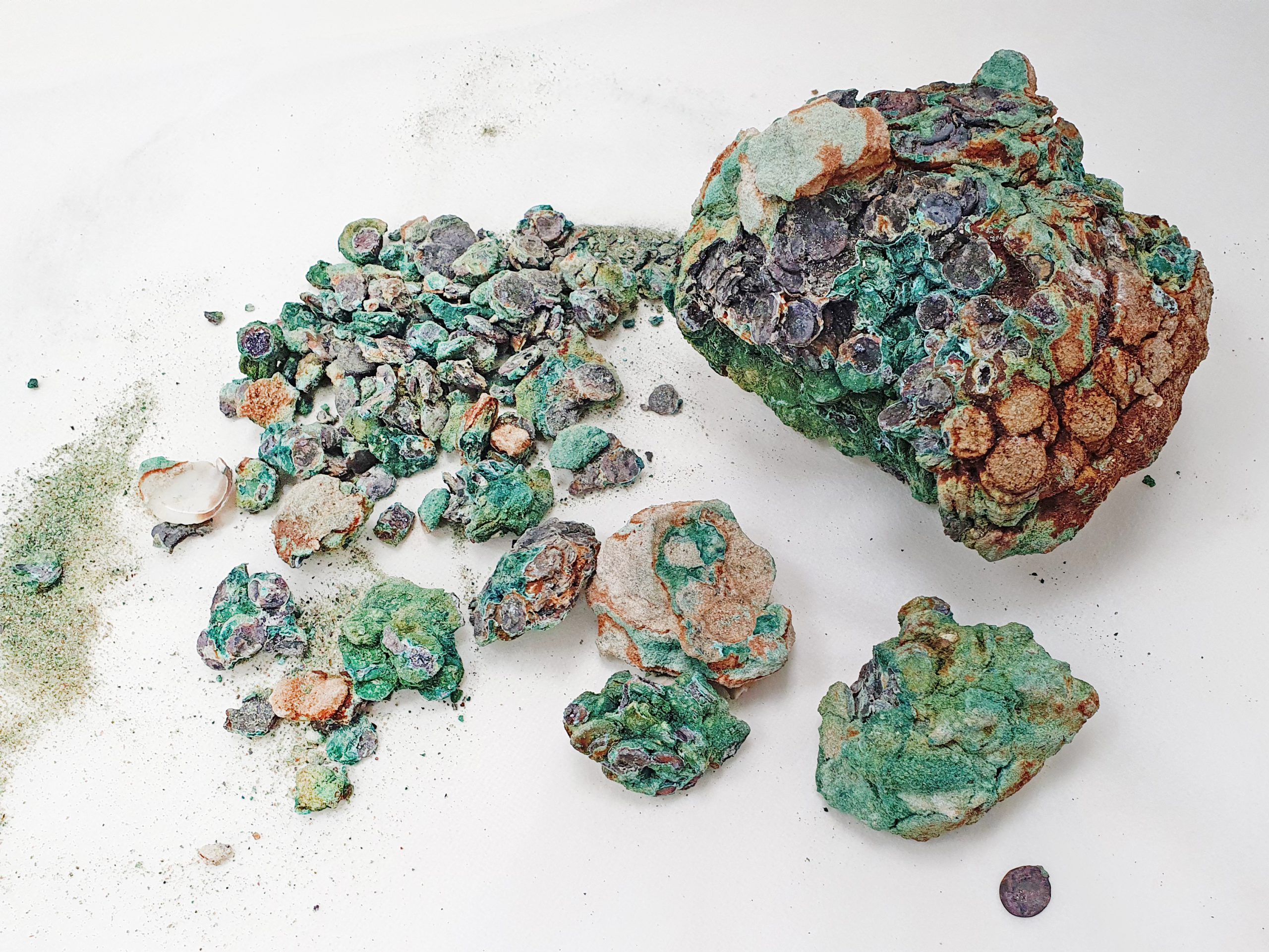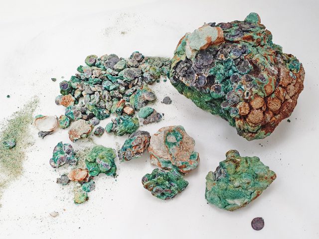 המטבעות, אשר שהו במשך מאות שנים בתוך המים, הפכו לדבוקה אחת. מזיהוי ראשוני של ד"ר דונלד צבי-אריאל, מומחה מטבעות ברשות העתיקות, נראה כי מדובר במטבעות מתחילת המאה ה-4 לספירה.