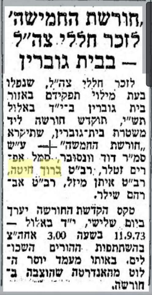 "ביום שלישי י"ד אלול תשל"ג יתקיים טקס נטיעת חורשה והסרת הלוט מעל המצבה לזכר חמישה לוחמים שנפלו באזור בית ג'וברין. הטקס יתקיים בחורשה ליד משטרת בית ג'וברין".