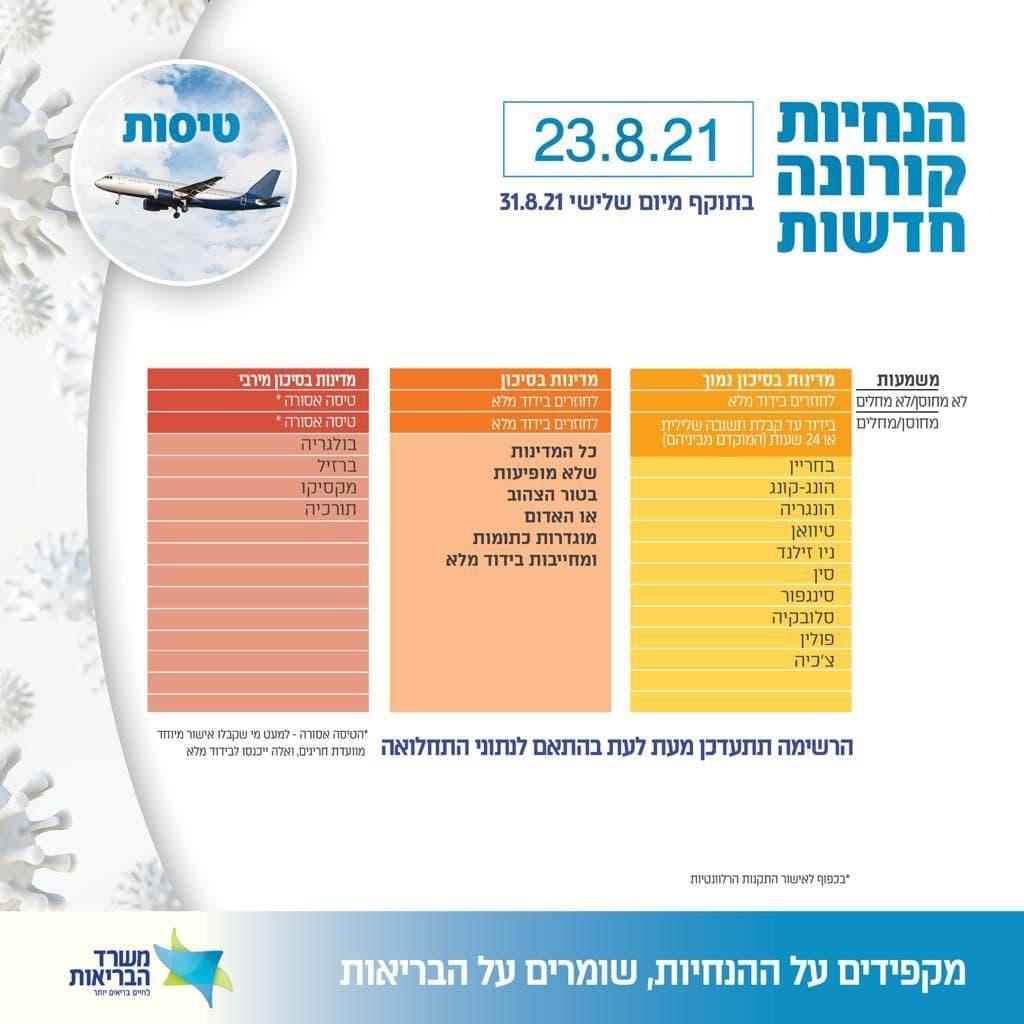 משרד הבריאות מעדכן כי החל מיום שלישי הבא (31.8) תעודכן רשימת סיווג המדינות, אליהן אסור לטוס, כאלה שמחייבות בידוד של שבוע, וכאלה שהחוזרים מהם ייפטרו מבידוד.