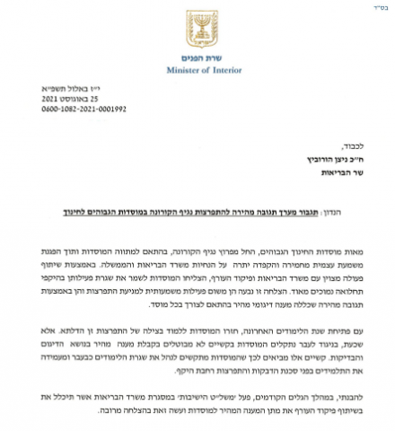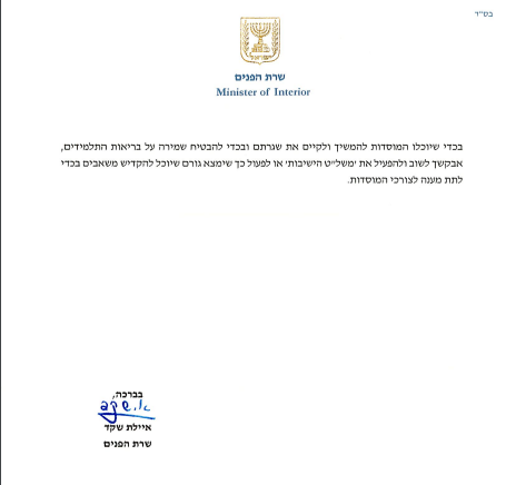 פרסום ראשון: שרת הפנים איילת שקד שיגרה היום (רביעי) מכתב לשר הבריאות ניצן הורוביץ בבקשה לפתוח מחדש את משל"ט הישיבות במשרד הבריאות במטרה למנוע התפרצות הדבקה בישיבות הגבוהות, ההסדר ובישיבות החרדיות.