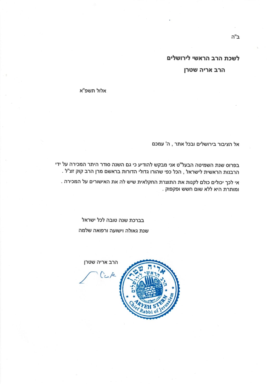 בפרוס שנת השמיטה הבעל"ט אני מבקש להודיע כי גם השנה סודר היתר המכירה על ידי הרבנות הראשית לישראל, הכל כפי שהורו גדולי הדורות בראשם מרן הרב קוק זצ"ל. אי לכך יכולים כולם לקנות את התוצרת החקלאית שיש לה את האישורים על המכירה. ומותרת היא ללא שום חשש ופקפוק.