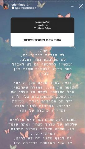עדן פינס ענתה: "אמת. לא אוכלת פירות ים, לא מערבבת בשר וחלב. עכשיו החלטתי גם לא לאכול בשר בחו"ל ולשמור שעות בין לבין".