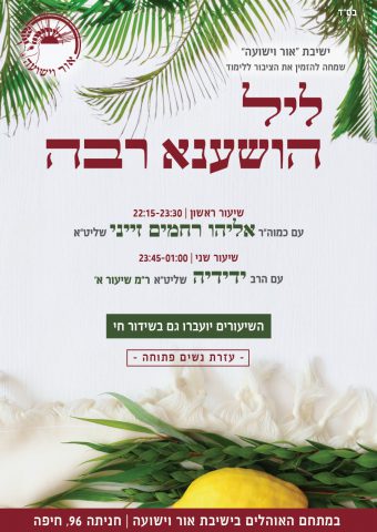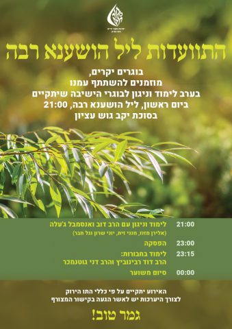 ליל לימוד הושענא רבה בישיבת 'מאיר הראל' מודיעין. מ21:30 עם הרב יעקב שפירא ראש ישיבת מרכז הרב ועד הבוקר. עם הרבנים ליאור אנגלמן, יששכר היימן, יוני לביא ועוד.