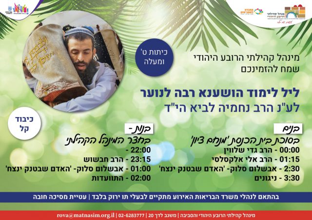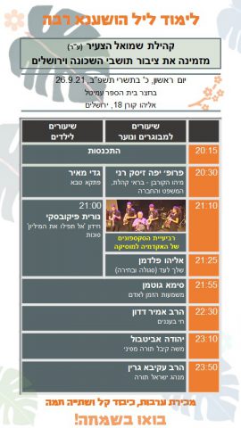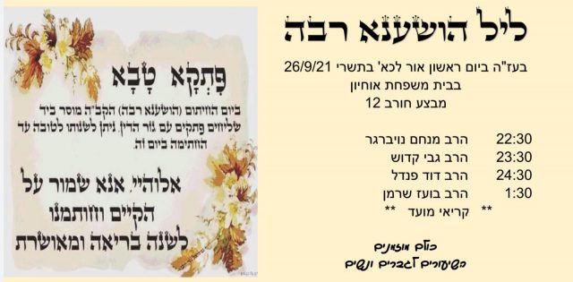 ישיבת מרכז הרב. יתקיים לימוד ליל הושענא רבה בסוכת הישיבה. הכניסה לבעלי חיסון שלישי/מחלימים. מתחילים בשעה 20:00 עד הבוקר.