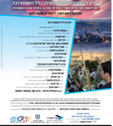 הושענא רבה בהר הזיתים. החל מ22:00 במלון שבע הקשתות. עם הרב הראשי לישראל הרב דוד לאו, הרב שמואל אליהו ועוד.