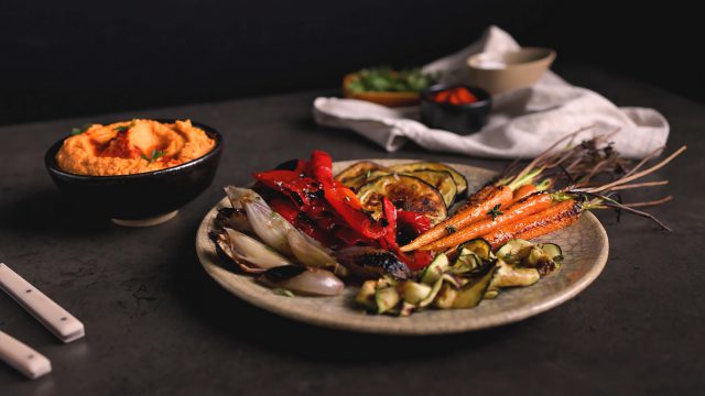 הגשה: כשהירקות מבושלים מניחים ומסדרים אותם על מצע חומוס העגבניות שהכנו, מתבלים במלח וטימין טרי.